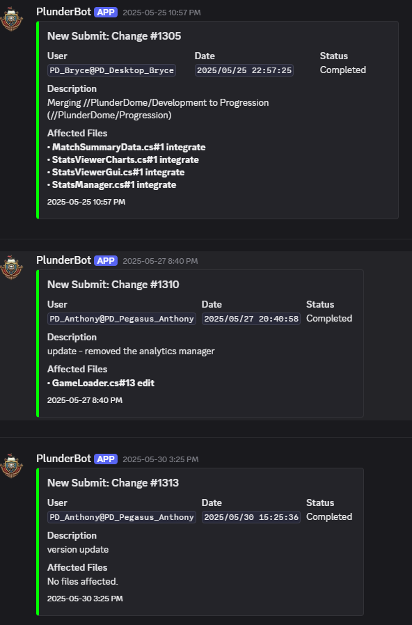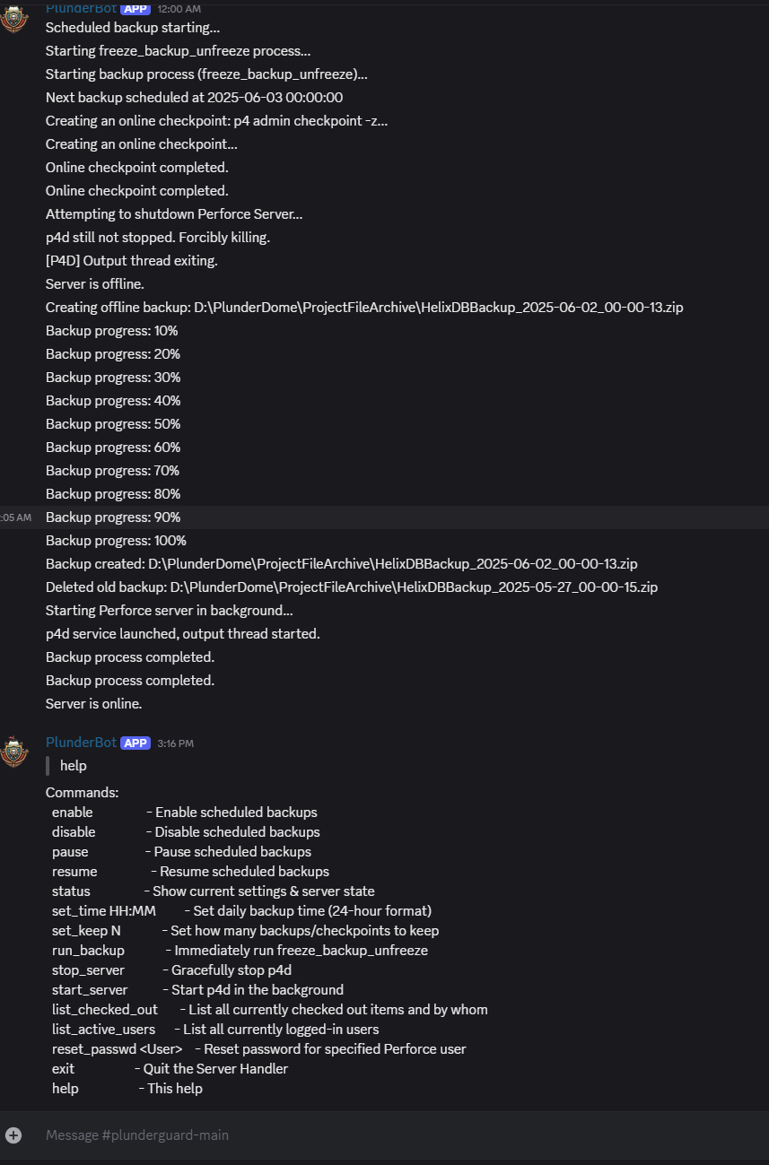 PlunderGuard is a custom-built Python Discord bot that manages and automates my Perforce server, powering the development workflow for Plunderdome and future projects.