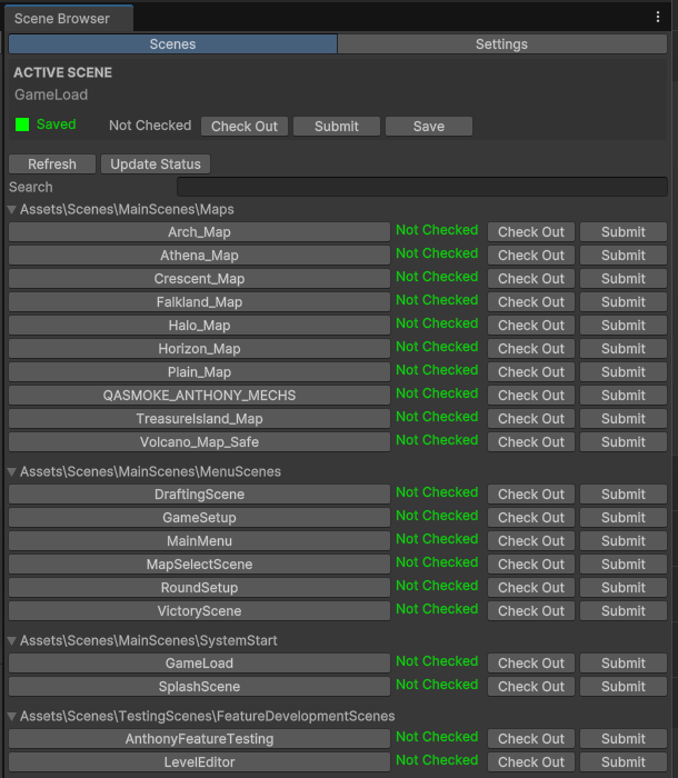 The Scene Browser is a custom Unity Editor tool designed to streamline scene management, with full Perforce integration to support team collaboration and version control.